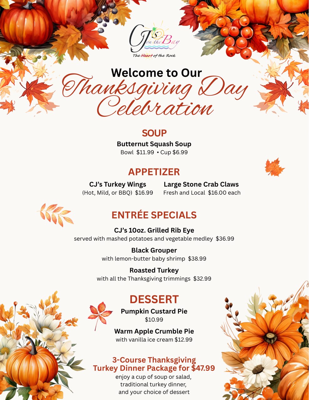 Easily accessible by both water and land, the Esplanade docks offer free, public dockage making CJ’s on the Bay an ideal spot for lunch or dinner after enjoying any nautical experience. Our outside Gazebo is the largest on Marco Island and features open seating. Restaurant seating features both inside dining room and outside patio seating, and reservations are strongly recommended. Free Wireless Internet access is available. Live outside entertainment every Thursday 6-9pm (weather permitting).